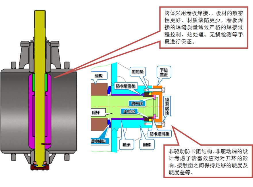 蝶板與閥桿的連接采用花鍵連接方式,高溫下閥軸線膨脹系數(shù)與閥體不一致時(shí),可保證閥桿自由的脹縮;