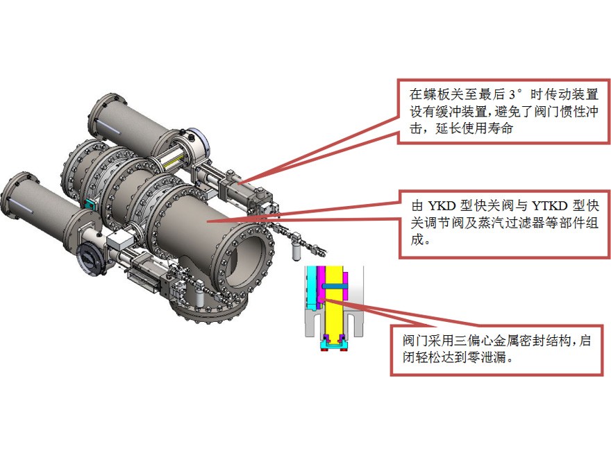 用于補汽式汽輪機系統(tǒng)上,它安裝于管道上能夠自動調(diào)整蒸汽流量,保證向用戶提供符合要求的蒸汽壓力。當(dāng)系統(tǒng)出現(xiàn)故障需要關(guān)閉時,兩閥將同時快速關(guān)閉,確保系統(tǒng)運行安全可靠;
