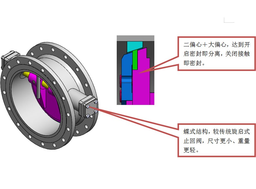 斜置蝶板:根據(jù)用戶需要,可提供斜置蝶板結(jié)構(gòu),止回時(shí)間更快。