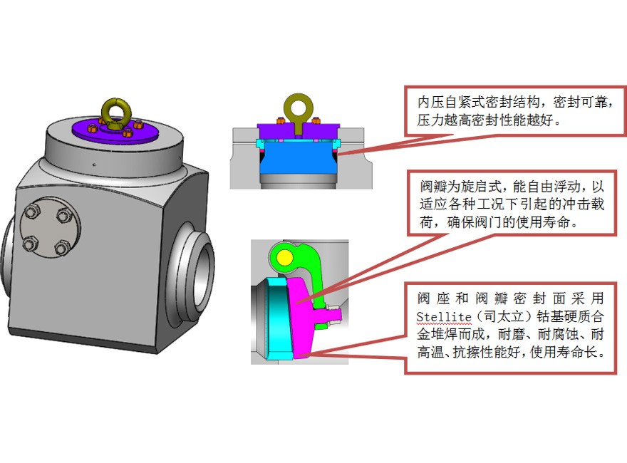 閥座和閥瓣密封面采用Stellite(司太立)鈷基硬質(zhì)合金堆焊而成,耐磨、耐腐蝕、耐高溫、抗擦性能好,使用壽命長;